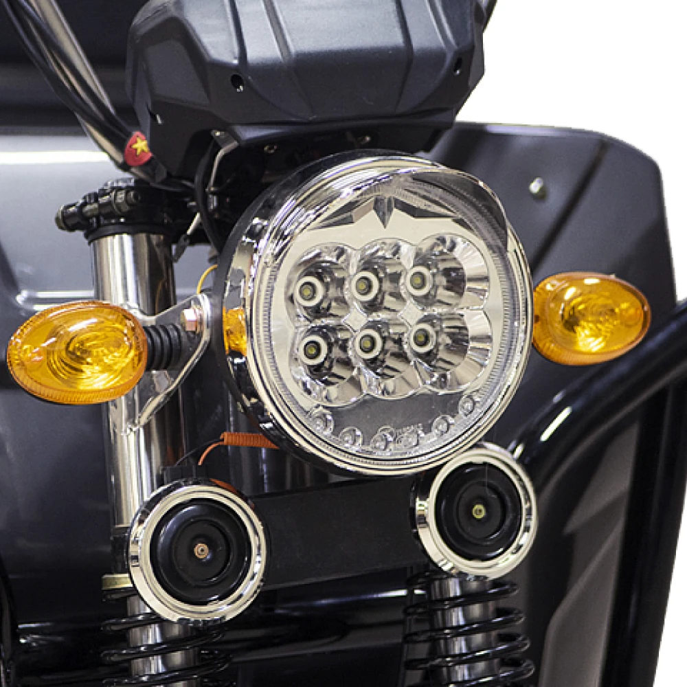 Грузовой электротрицикл Rutrike D4 NEXT II 60V1500W синий – мощная техника в презентабельном дизайне моментально привлекает внимание представителей бизнеса и фермеров. Объемный багажник, вместительное виденье, лучшие параметры удобства и комфорта заставляют внимательнее присмотреться к техническим характеристикам. Наш интернет-магазин предлагает купить электротрицикл по разумной стоимости. Каждому покупателю гарантирована бесплатная консультация, помощь в оформлении заказа. Модель оснащена мощным движком на 1500 Вт, который в сочетании с емкой батареей (от 55А*ч) обещает максимальный разгон до 25 км/час, которого хватает на преодоление дистанции до 80 км. Производитель обращает внимание, батарея не входит в комплектацию. Купить АКБ, подобрать максимально совместимую можно благодаря нашему интернет-магазину. Из других преимуществ производитель выделяет максимальную оснащенность функционалом. Техника оборудована зеркалами заднего вида, гидравлической амортизационной подвеской, информационным дисплеем. Имеется дополнительное место для пассажира. Широкая платформа для ног в сочетании с сиденьем исключает дискомфорт и проблемы с позвоночником. Широкие колеса (переднее х заднее - 3,50-R12 х 4,00-R12) отлично сцепляются с грунтом. Вместительный кузов размерами 3270 x 1200 x 1450 ДхШхВ – настоящая находка для предприимчивых личностей