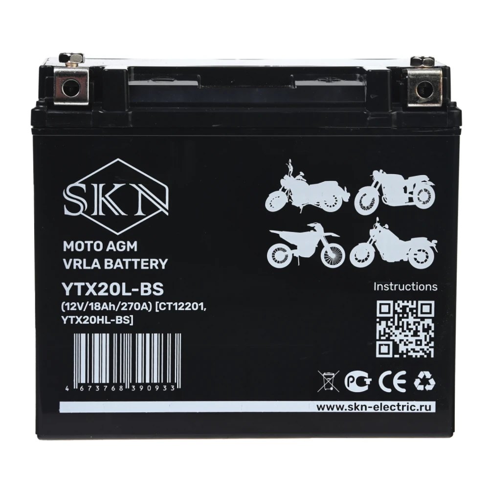 Аккумулятор стартерный для мототехники SKN YTX20L-BS (12V/18Ah/270A) [CT 12201, YTX20HL-BS]